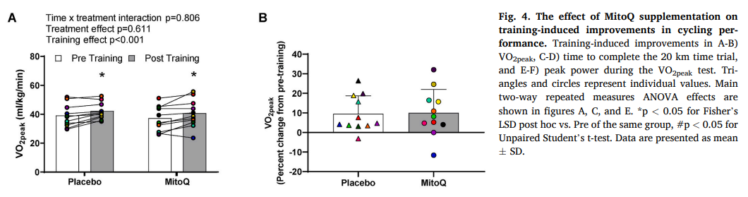 To test whether this distinction mattered in practice, participants undertook a 3‑week double‑blind HIIT programme while receiving either Mitoquinol (20 mg/day) or placebo. Despite identical training loads, those receiving Mitoquinol exhibited significantly greater improvements in peak power output. Rather than merely avoiding interference, mitochondrial redox optimisation appeared to enhance functional adaptation to training.